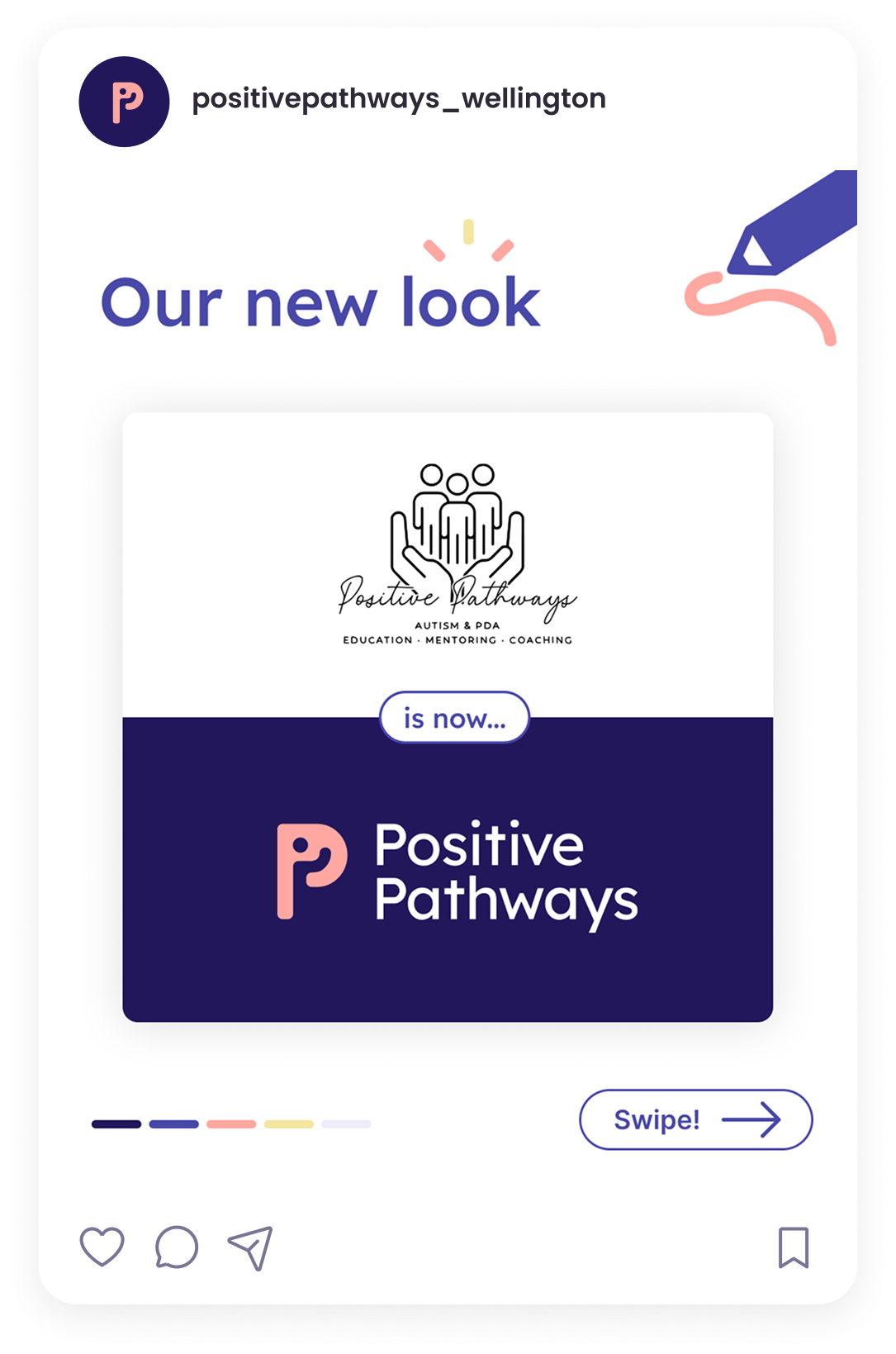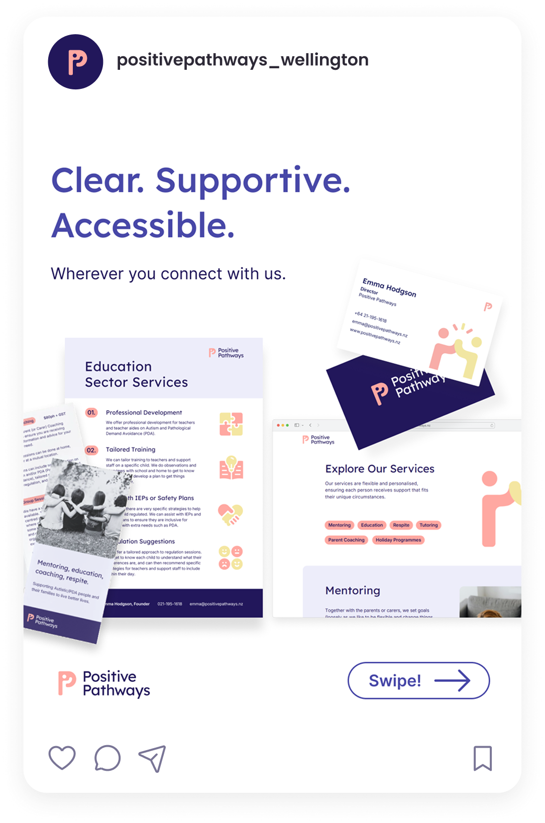 Alongside the rebrand was the creation of Positive Pathways’ new website. With a strong focus on user needs, the site was designed for neurodivergent individuals, as well as parents and caregivers, so they can easily learn or find the information they need. Social media is used to promote events and share updates, with a consistent visual style maintained across Facebook and Instagram.